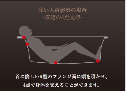 そのうえ、浅い入浴姿勢でも深い入浴姿勢でも体をしっかり支えてくれるフィット感。人間工学に基づいたフォルムとホーロー素材がくつろぎのバスタイムを叶えます。