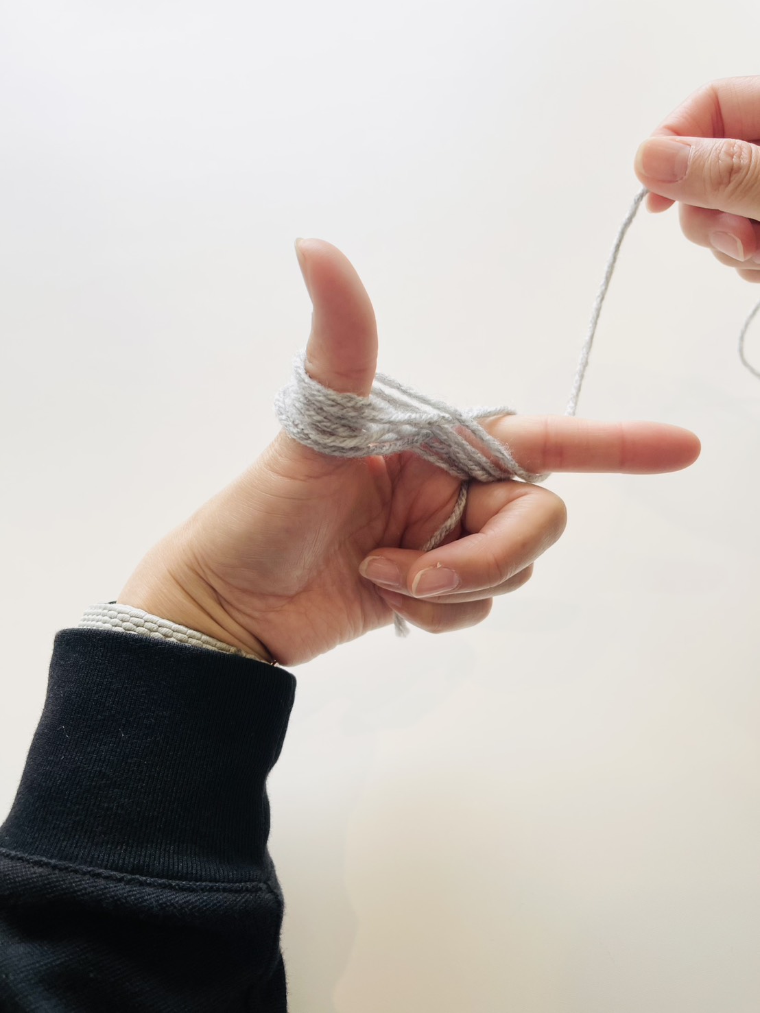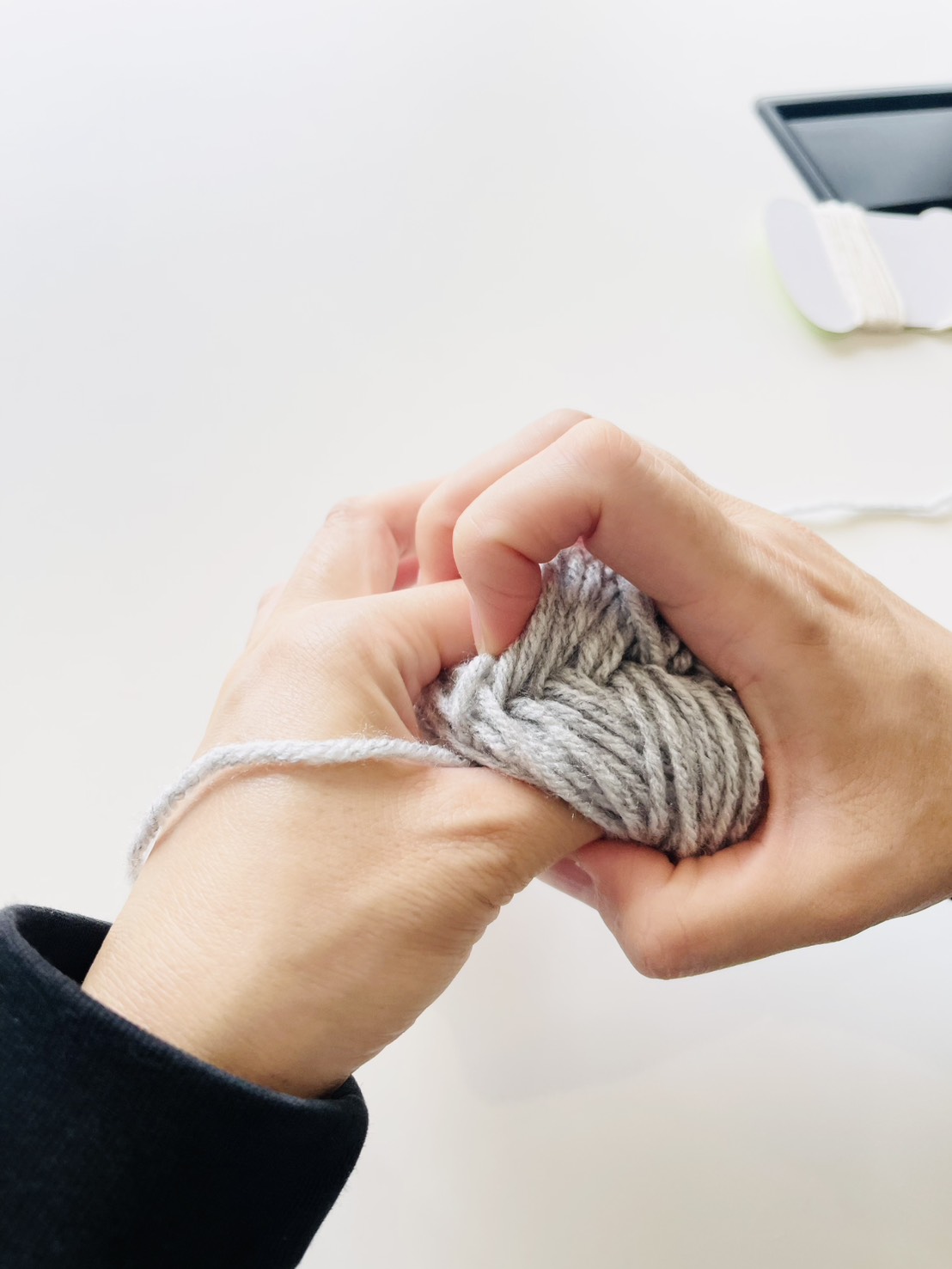 毛糸玉を作ります。写真のように親指と人差し指を軸にして八の字に毛糸を巻いていきます。