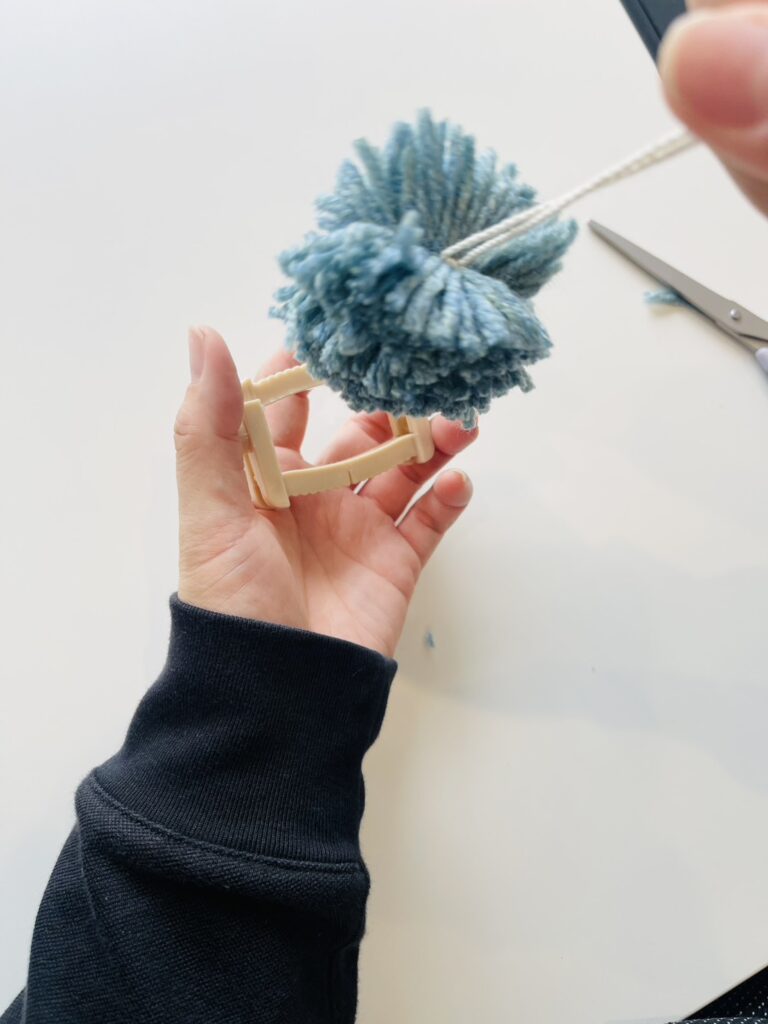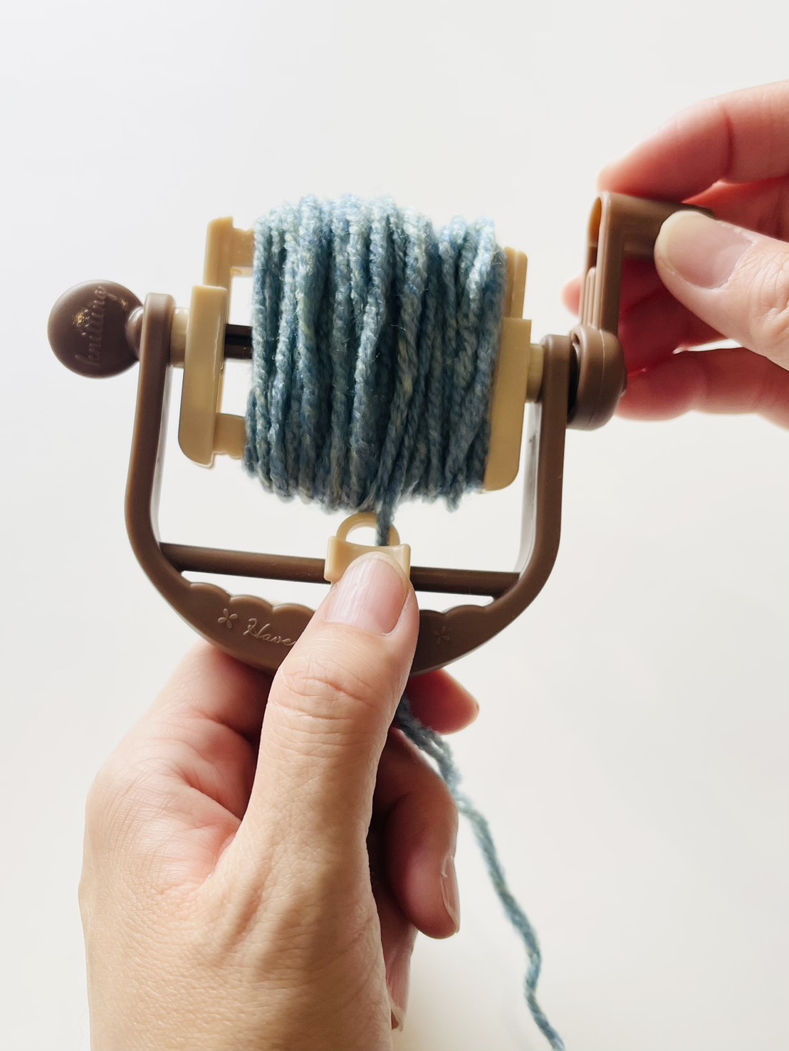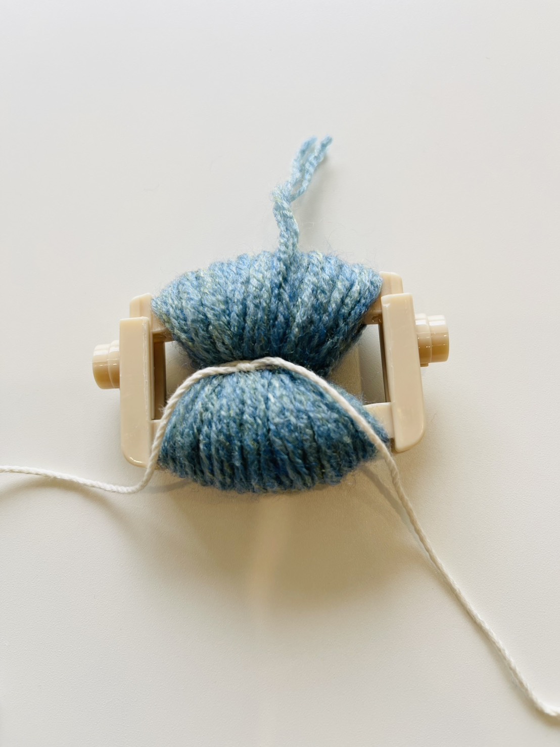ポンポンを作ります。100円ショップで購入したポンポンメーカーを使って毛糸を巻いていきます。