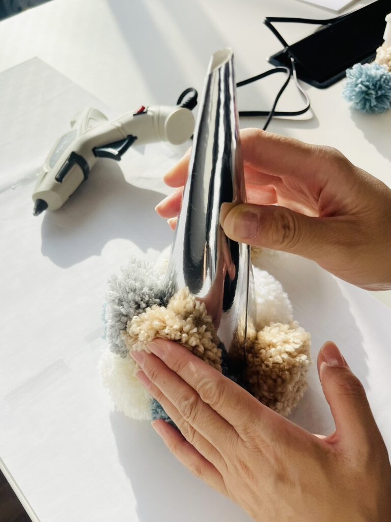 いよいよグルーガンで飾りを貼り付けていきます。写真はポンポンツリーを作っています。今回はパーティーハットの留め具を外して細く作り直しました。