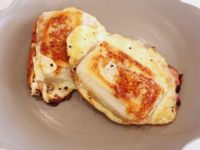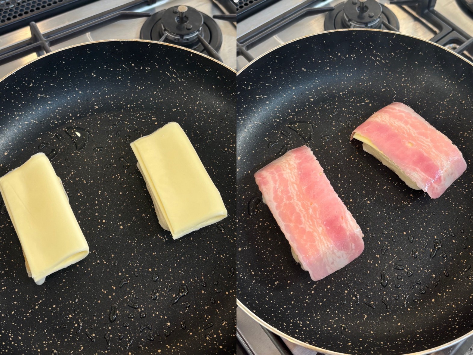 焼いた餅の上に折りたたんだスライスチーズ、さらにベーコンを乗せます。