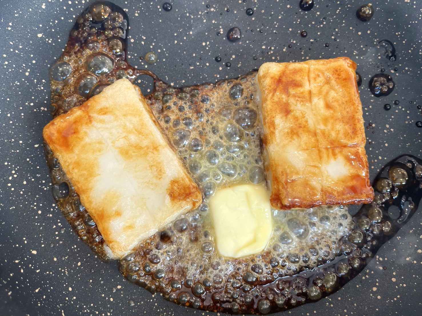 砂糖水に絡ませながら餅の両面がこんがりするまで焼きます。