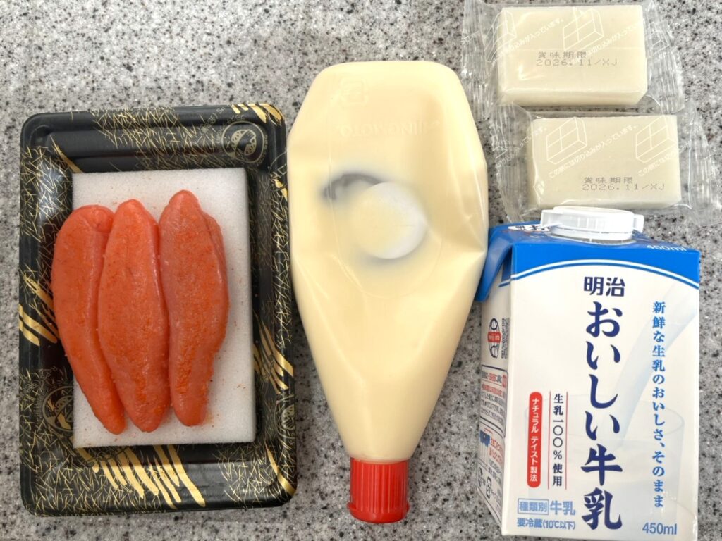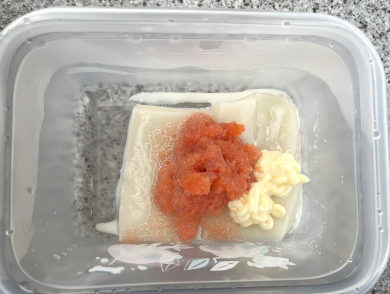 温め終わって水を捨てたら、柔らかくなった餅に明太子とマヨネーズと牛乳を絡めます。