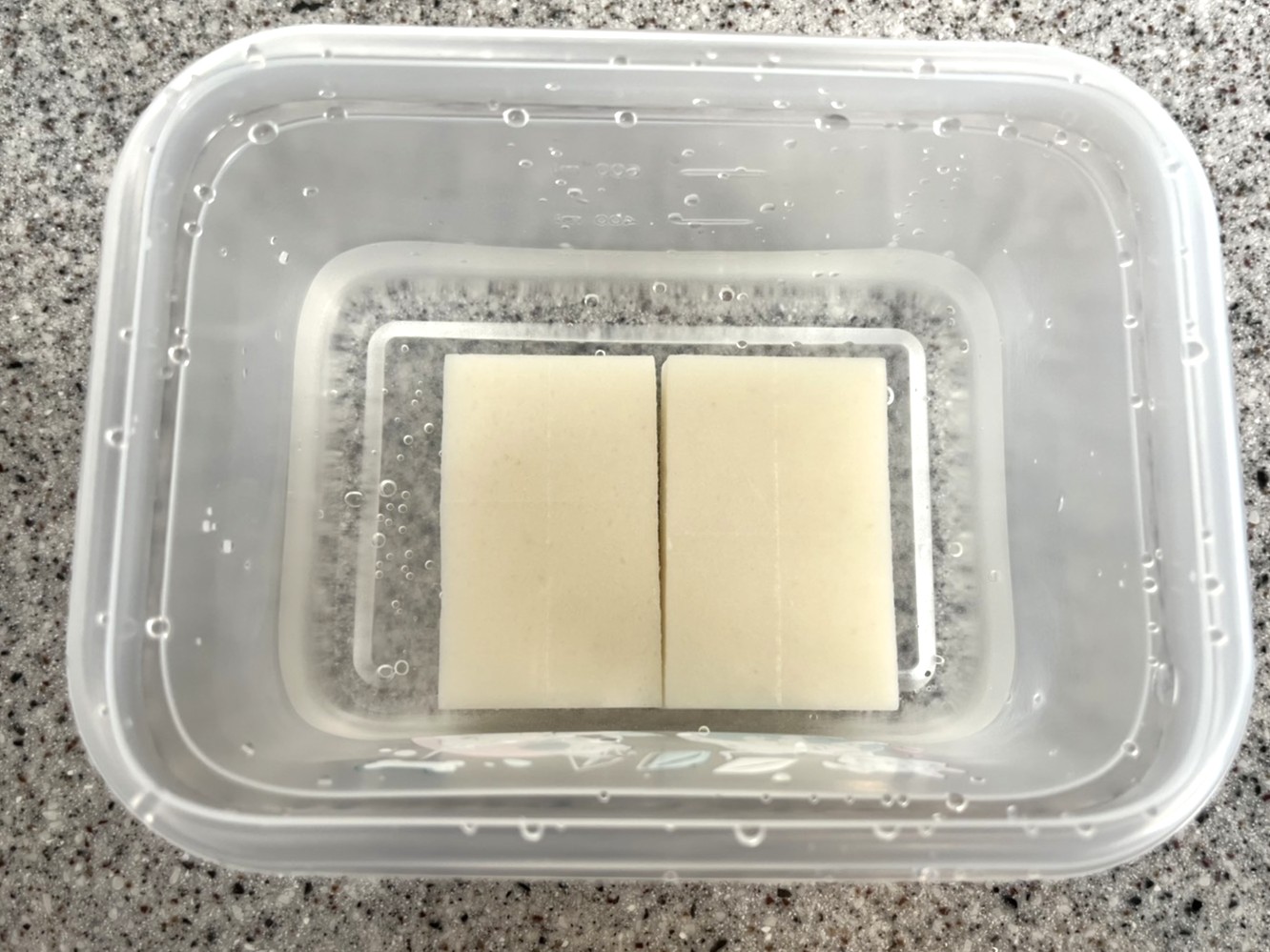 耐熱容器に餅が浸るぐらいの水を入れて、そのままレンジで600w2分30秒温めます。